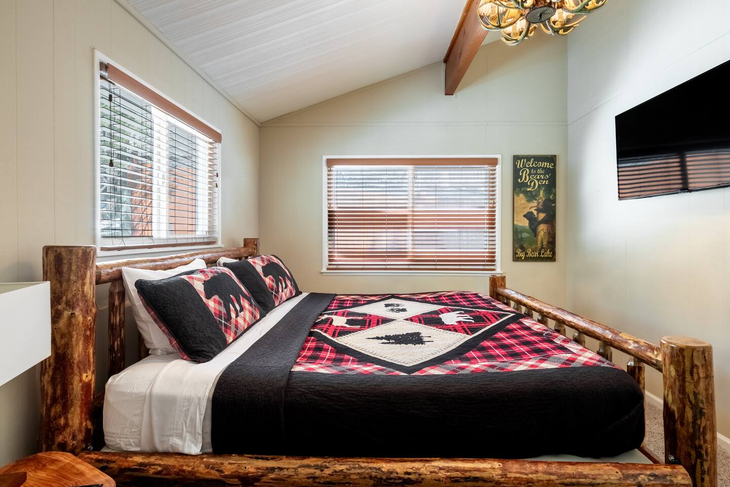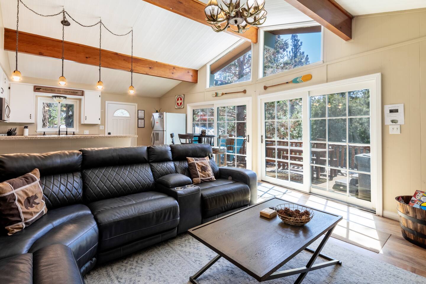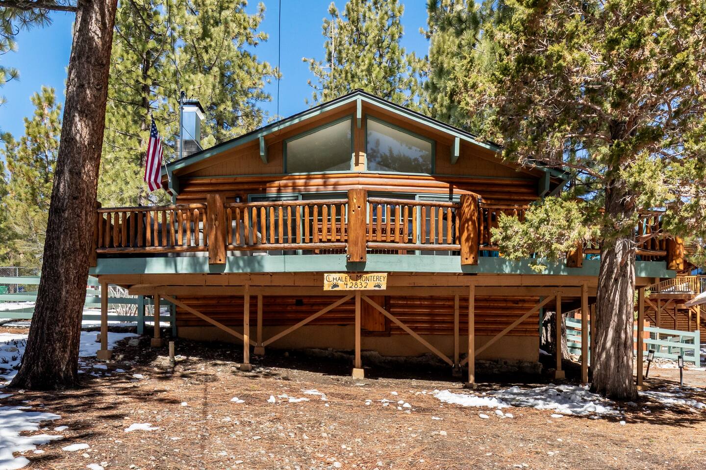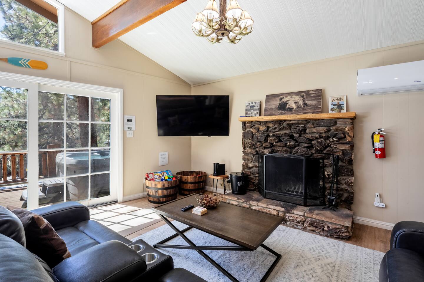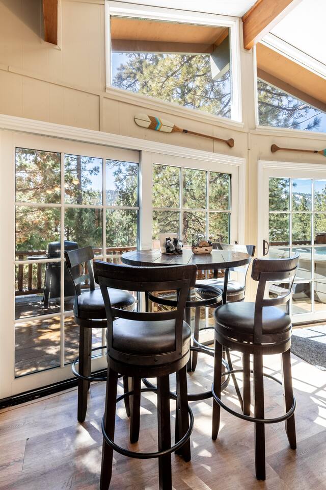 Chalet Monterey will greet you with a spacious open floor plan and knotty beamed vaulted ceilings throughout, plus a toasty wood-burning fireplace to keep you cozy while you watch the snowfall in the great outdoors through a wall of windows. Built for entertaining, the great room and kitchen are divided by a large high top bar and when the 2 sliding doors are open, you'll have twice the space on the new trex deck where you'll find an additional dining table for 4, propane grill, and a hot tub to enjoy after a long day of adventure. Enjoy your favorite shows, streaming TV and movies on the 65 inch flatscreen Smart TV while lounging on the comfy dual reclining sectional sofa outfitted with USB charging stations (Guests to use their own accounts for streaming services like Netflix, Hulu, Amazon Prime, etc). The fully operational kitchen has everything you need to prepare meals and new appliances -- we've got the "tools," you bring the "ingredients.” Grocery Outlet, Vons and Stater brothers are literally around the corner for supplies Each bedroom has TVs and brand new beautiful rustic log furniture. The master bedroom boasts a King-sized log bed, as well as a new LG washer and dryer (starter set supplied). The second bedroom is perfect for additional guests or the kids with two log framed full sized beds. Cabin has one full bathroom with tub. Check out our long list of amenities!