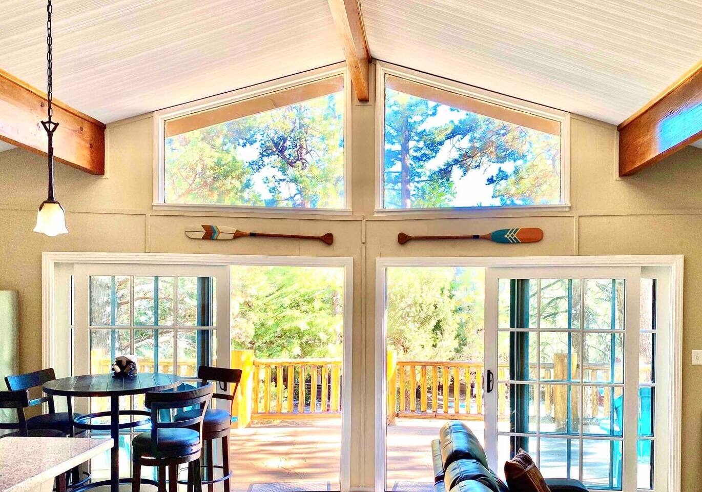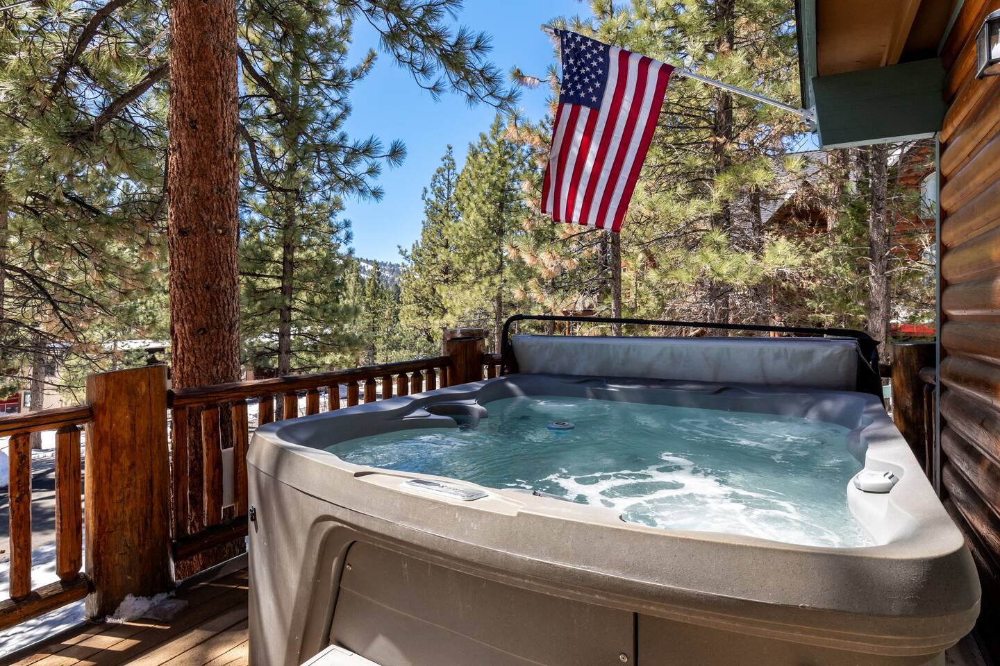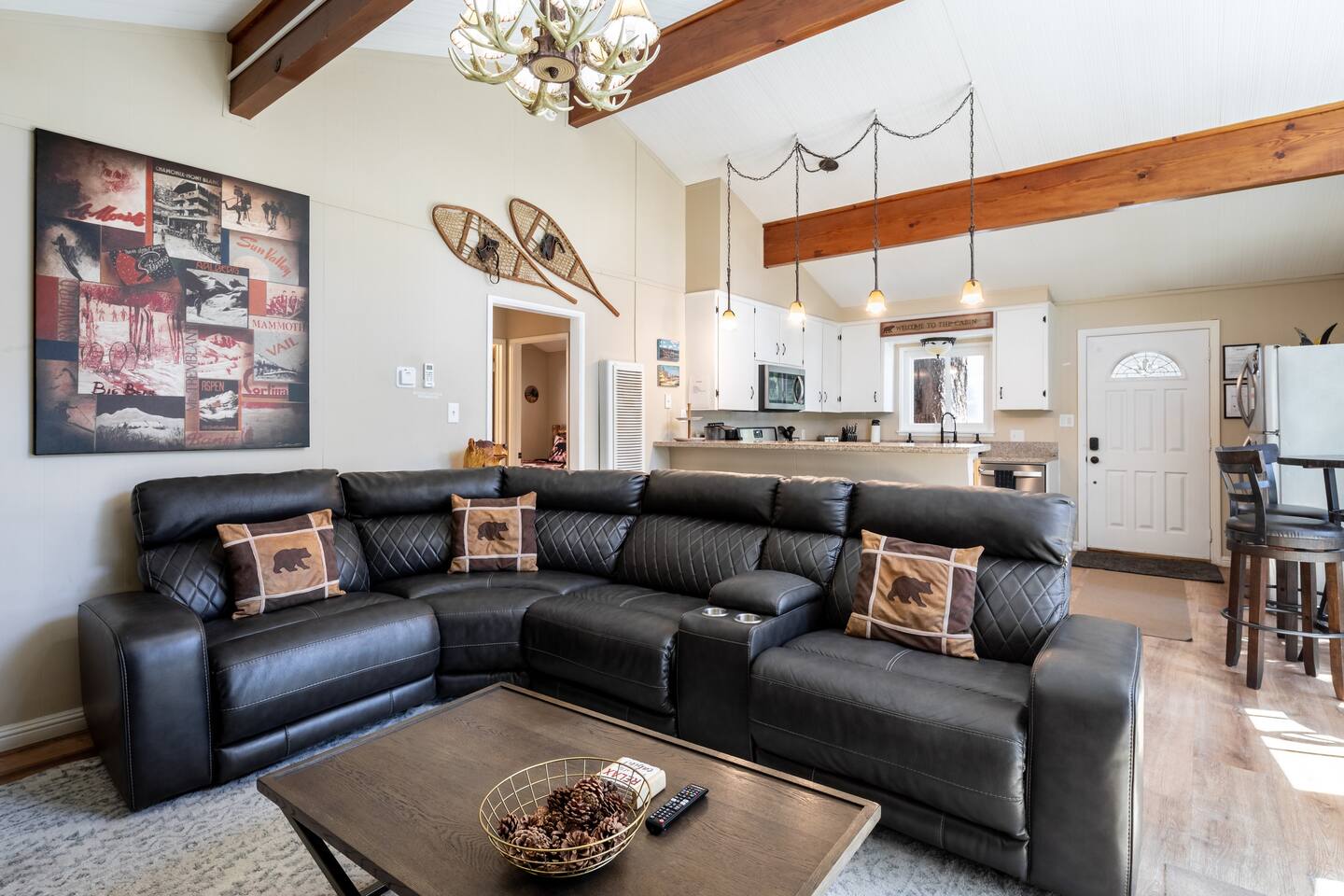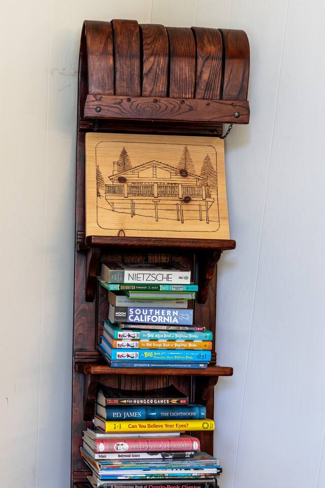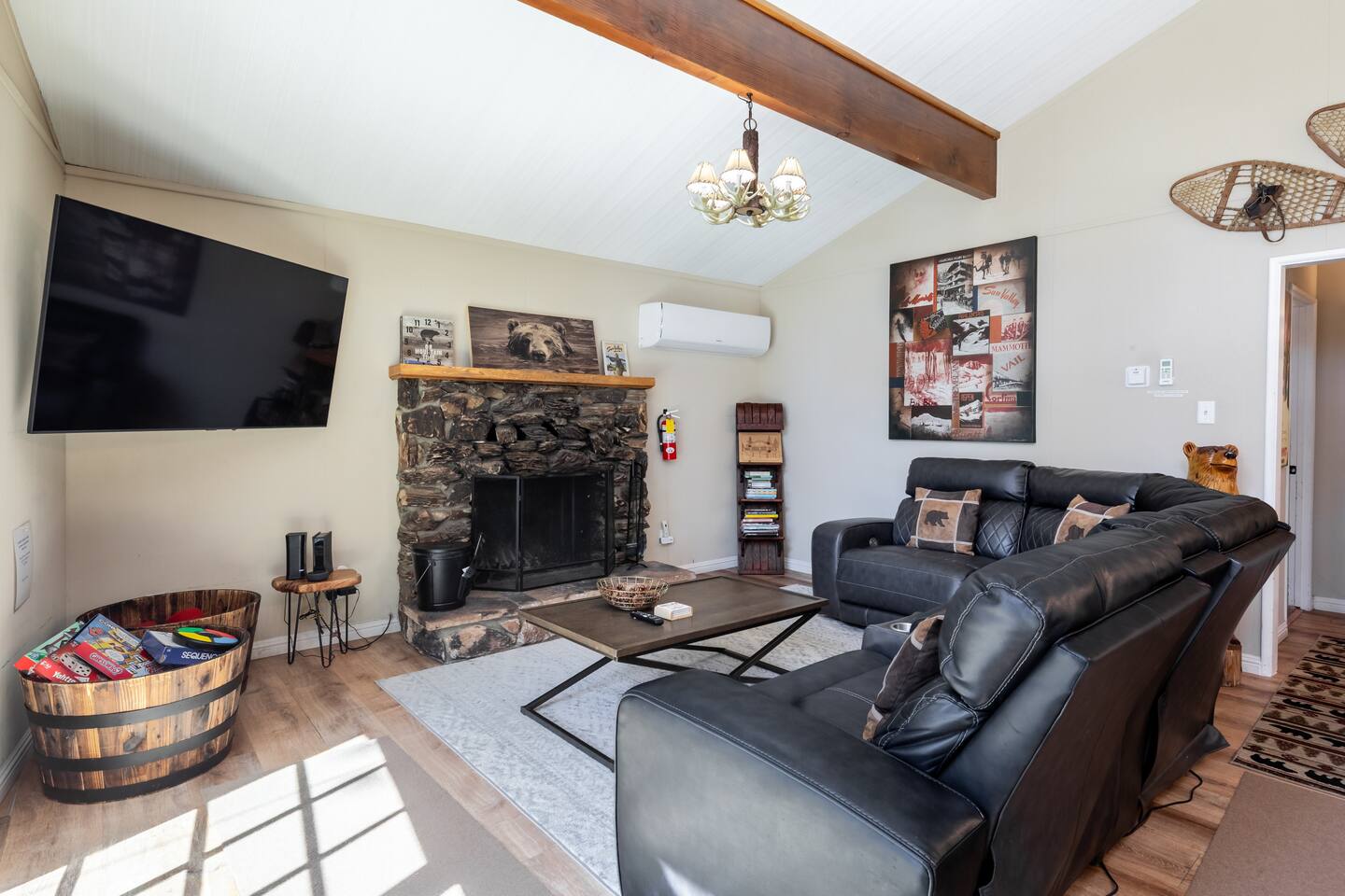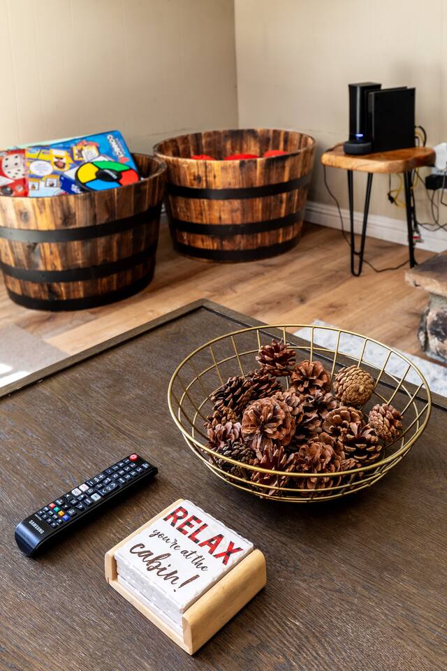 Chalet Monterey will greet you with a spacious open floor plan and knotty beamed vaulted ceilings throughout, plus a toasty wood-burning fireplace to keep you cozy while you watch the snowfall in the great outdoors through a wall of windows. Built for entertaining, the great room and kitchen are divided by a large high top bar and when the 2 sliding doors are open, you'll have twice the space on the new trex deck where you'll find an additional dining table for 4, propane grill, and a hot tub to enjoy after a long day of adventure. Enjoy your favorite shows, streaming TV and movies on the 65 inch flatscreen Smart TV while lounging on the comfy dual reclining sectional sofa outfitted with USB charging stations (Guests to use their own accounts for streaming services like Netflix, Hulu, Amazon Prime, etc). The fully operational kitchen has everything you need to prepare meals and new appliances -- we've got the "tools," you bring the "ingredients.” Grocery Outlet, Vons and Stater brothers are literally around the corner for supplies Each bedroom has TVs and brand new beautiful rustic log furniture. The master bedroom boasts a King-sized log bed, as well as a new LG washer and dryer (starter set supplied). The second bedroom is perfect for additional guests or the kids with two log framed full sized beds. Cabin has one full bathroom with tub. Check out our long list of amenities!