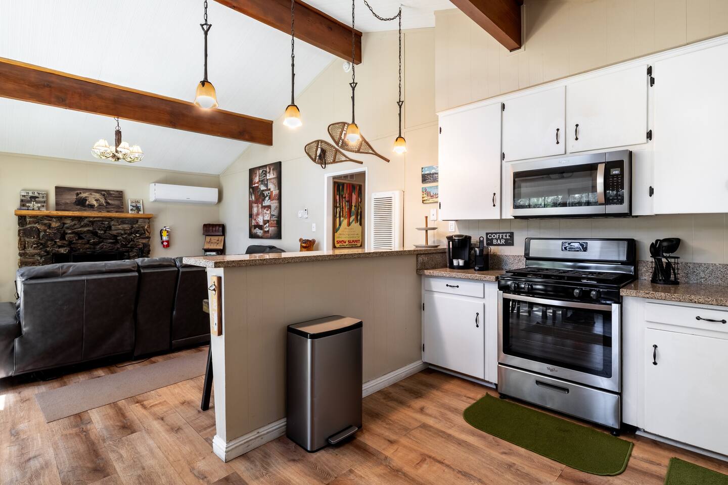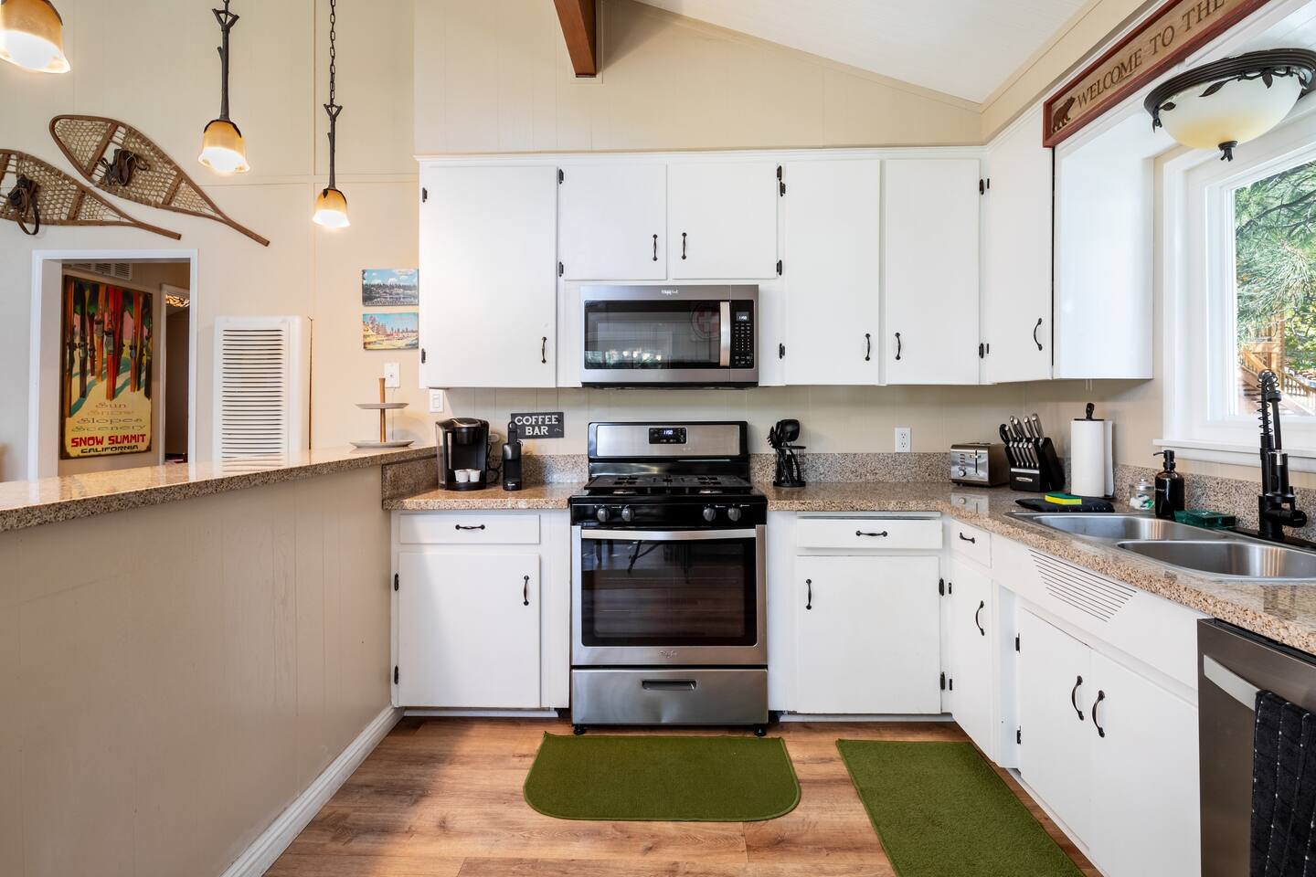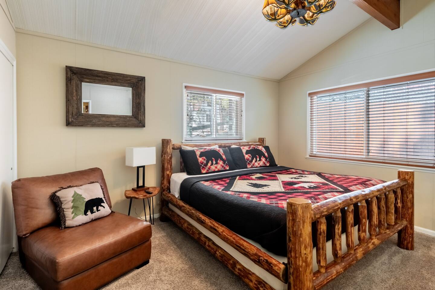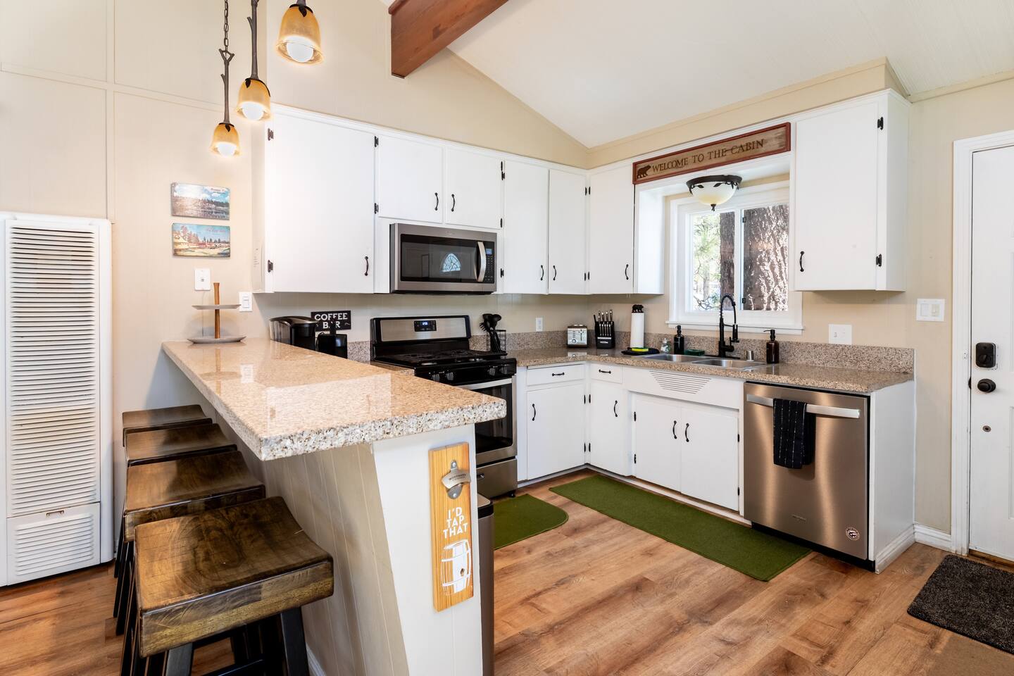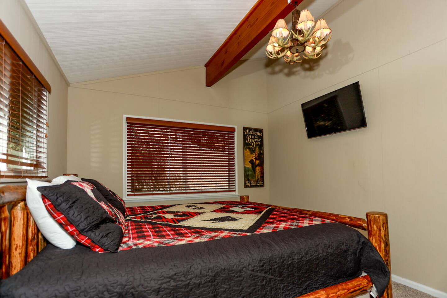 Chalet Monterey will greet you with a spacious open floor plan and knotty beamed vaulted ceilings throughout, plus a toasty wood-burning fireplace to keep you cozy while you watch the snowfall in the great outdoors through a wall of windows. Built for entertaining, the great room and kitchen are divided by a large high top bar and when the 2 sliding doors are open, you'll have twice the space on the new trex deck where you'll find an additional dining table for 4, propane grill, and a hot tub to enjoy after a long day of adventure. Enjoy your favorite shows, streaming TV and movies on the 65 inch flatscreen Smart TV while lounging on the comfy dual reclining sectional sofa outfitted with USB charging stations (Guests to use their own accounts for streaming services like Netflix, Hulu, Amazon Prime, etc). The fully operational kitchen has everything you need to prepare meals and new appliances -- we've got the "tools," you bring the "ingredients.” Grocery Outlet, Vons and Stater brothers are literally around the corner for supplies Each bedroom has TVs and brand new beautiful rustic log furniture. The master bedroom boasts a King-sized log bed, as well as a new LG washer and dryer (starter set supplied). The second bedroom is perfect for additional guests or the kids with two log framed full sized beds. Cabin has one full bathroom with tub. Check out our long list of amenities!