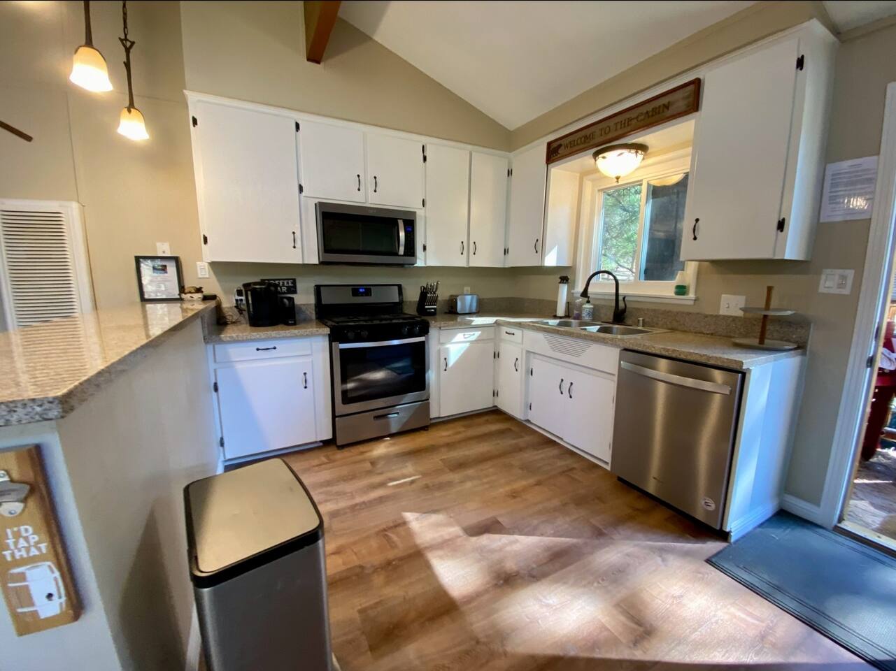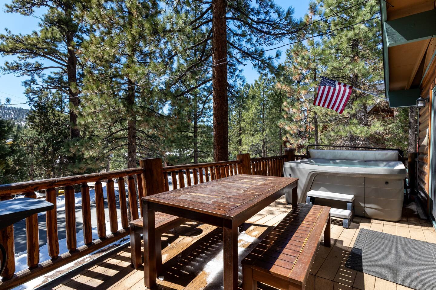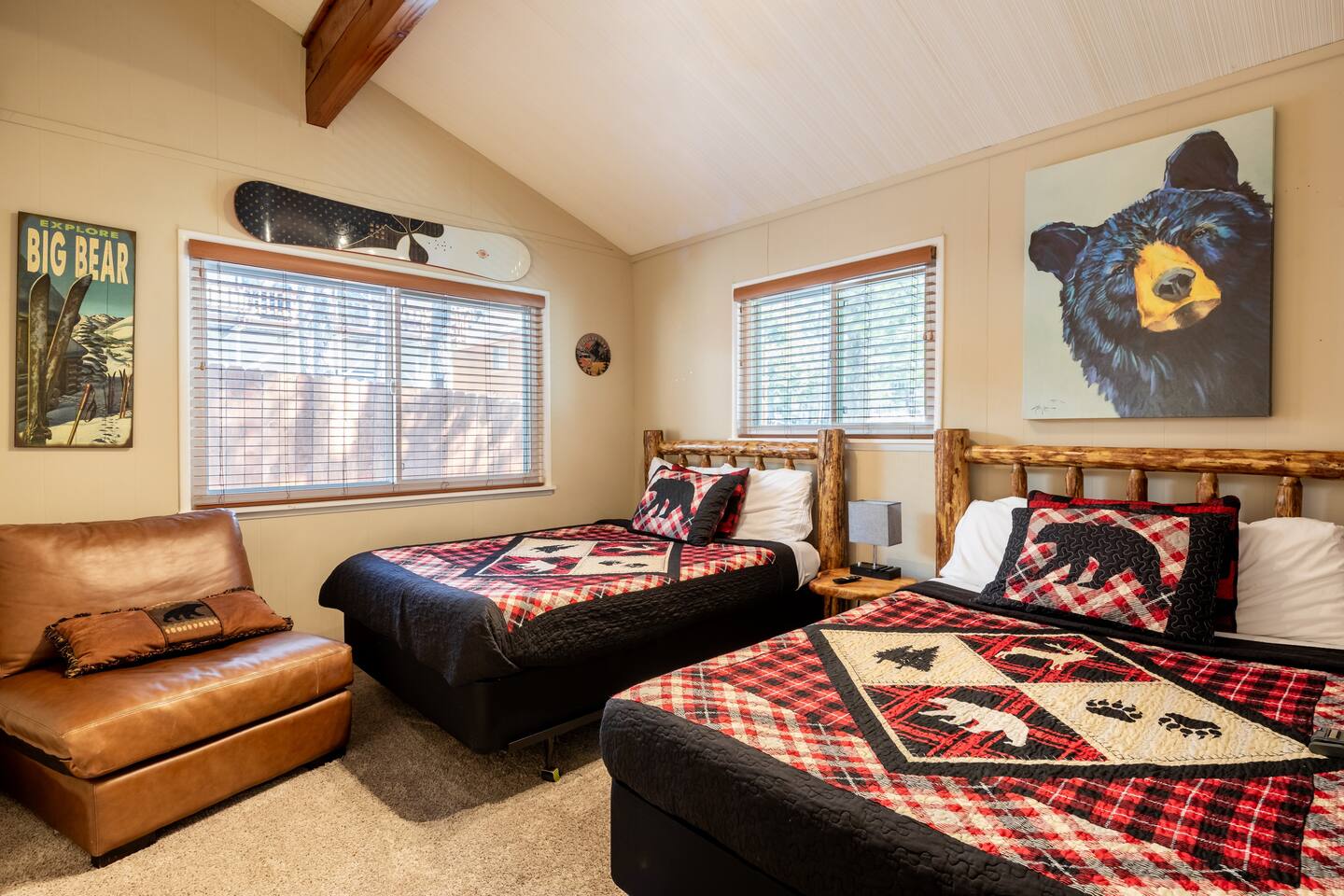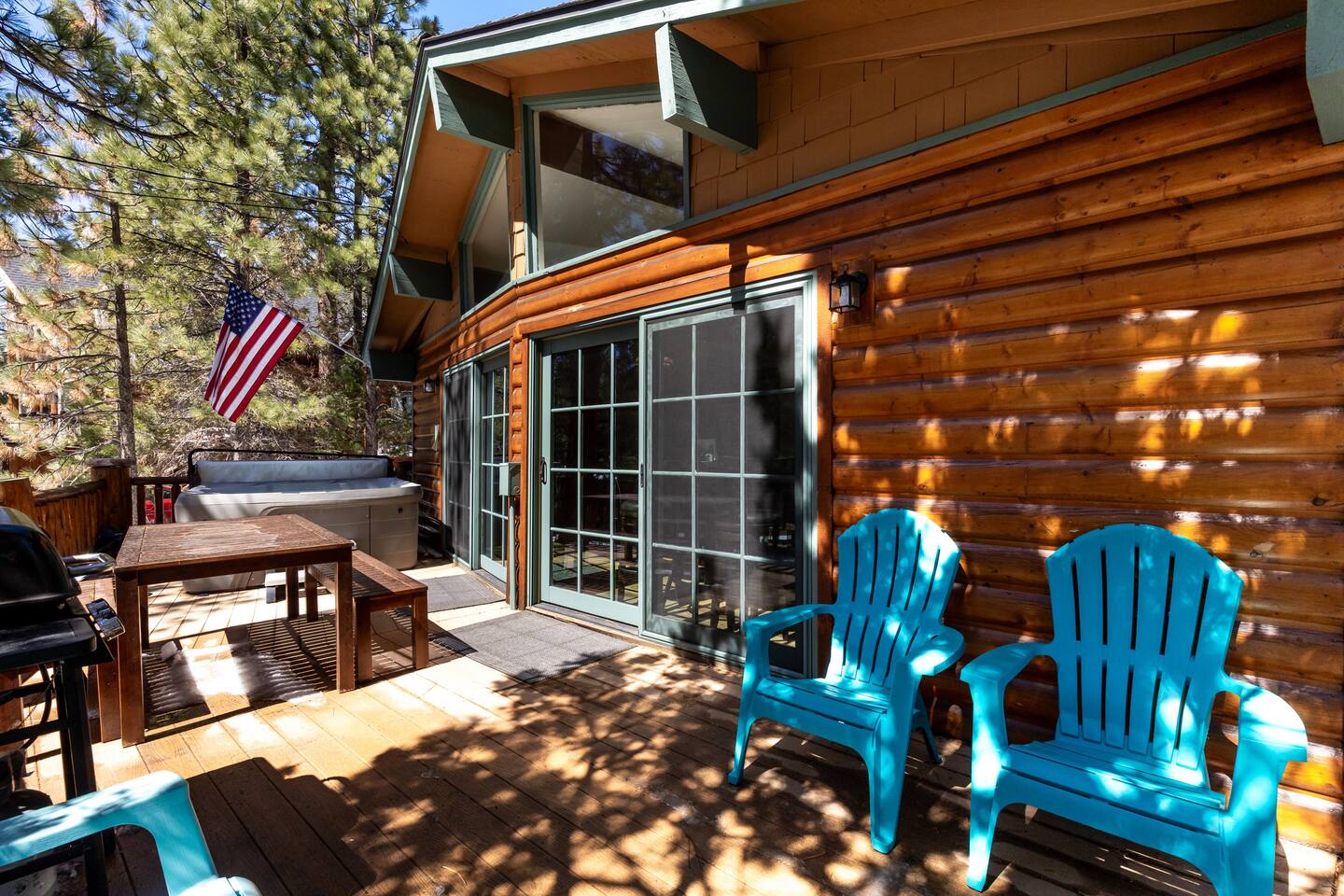 Chalet Monterey will greet you with a spacious open floor plan and knotty beamed vaulted ceilings throughout, plus a toasty wood-burning fireplace to keep you cozy while you watch the snowfall in the great outdoors through a wall of windows. Built for entertaining, the great room and kitchen are divided by a large high top bar and when the 2 sliding doors are open, you'll have twice the space on the new trex deck where you'll find an additional dining table for 4, propane grill, and a hot tub to enjoy after a long day of adventure. Enjoy your favorite shows, streaming TV and movies on the 65 inch flatscreen Smart TV while lounging on the comfy dual reclining sectional sofa outfitted with USB charging stations (Guests to use their own accounts for streaming services like Netflix, Hulu, Amazon Prime, etc). The fully operational kitchen has everything you need to prepare meals and new appliances -- we've got the "tools," you bring the "ingredients.” Grocery Outlet, Vons and Stater brothers are literally around the corner for supplies Each bedroom has TVs and brand new beautiful rustic log furniture. The master bedroom boasts a King-sized log bed, as well as a new LG washer and dryer (starter set supplied). The second bedroom is perfect for additional guests or the kids with two log framed full sized beds. Cabin has one full bathroom with tub. Check out our long list of amenities!