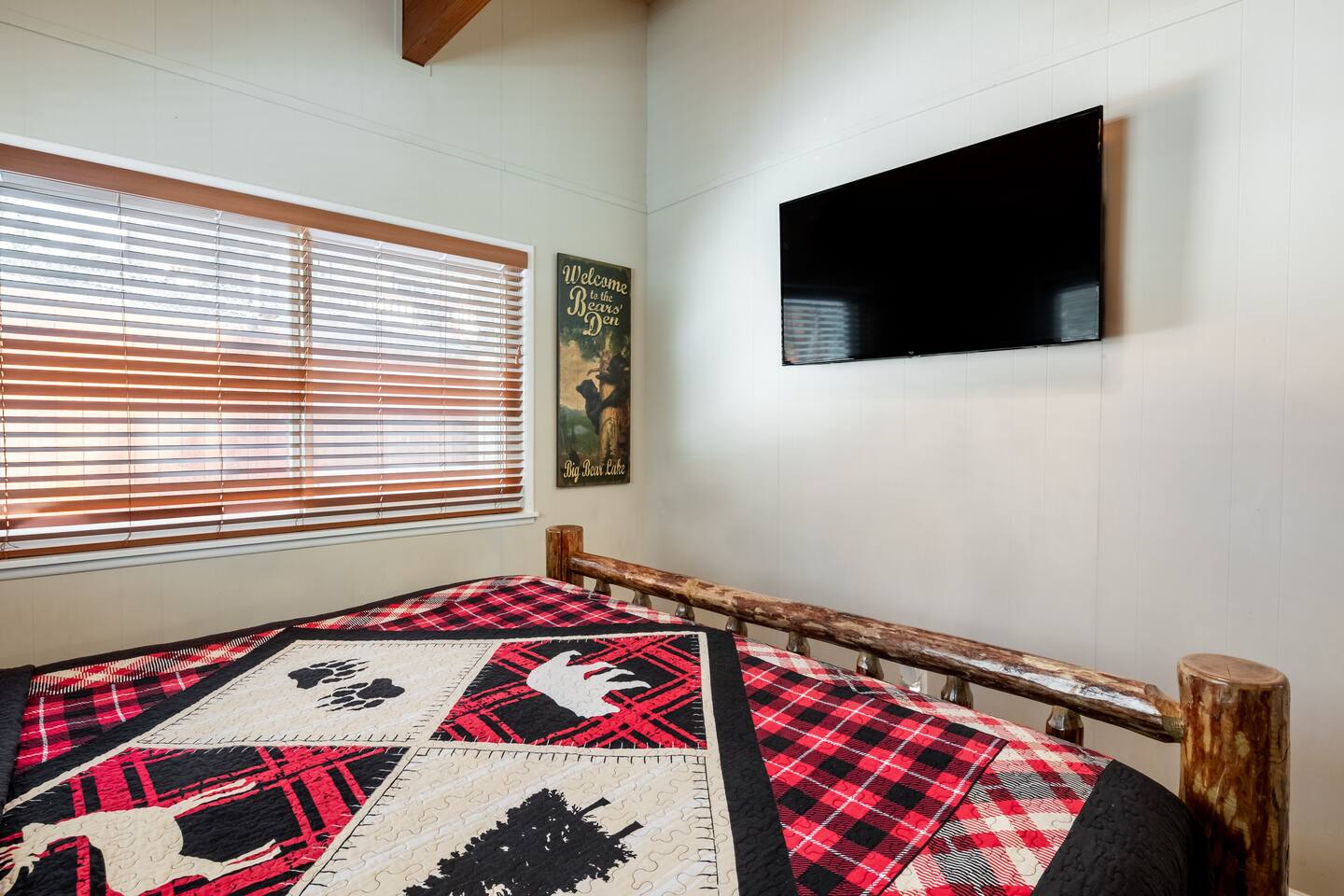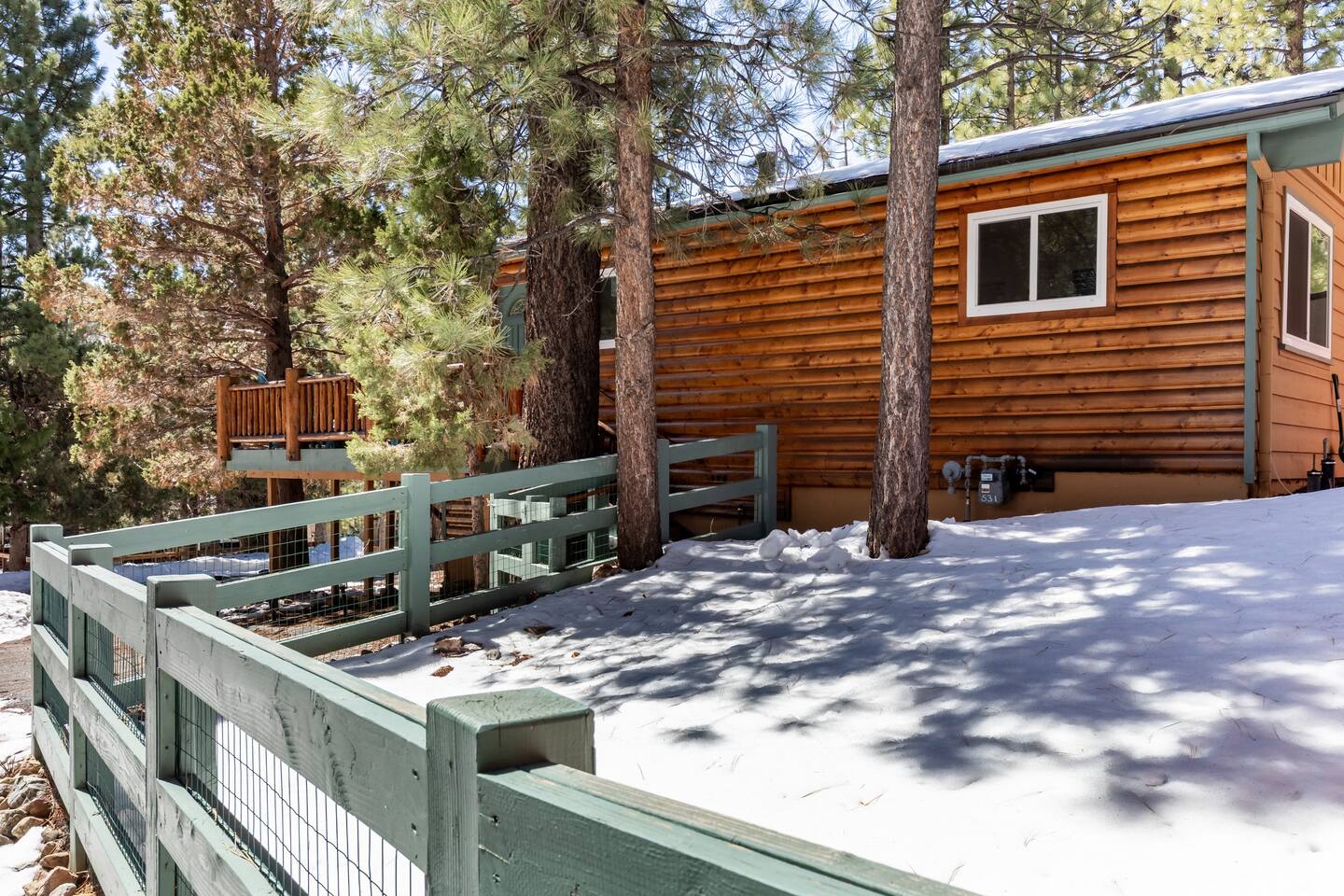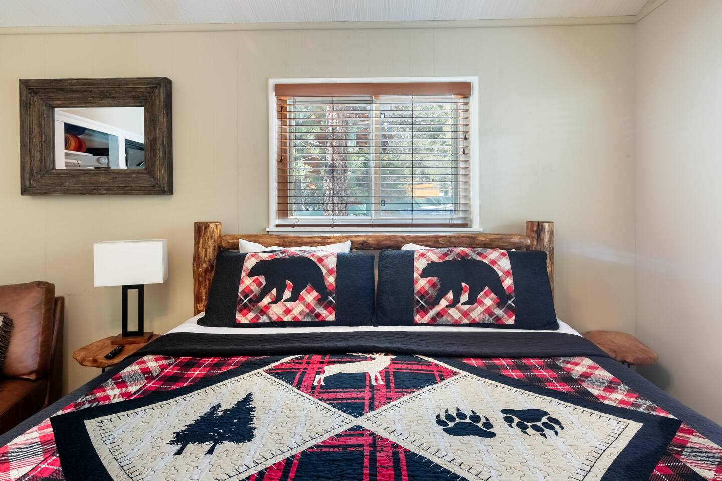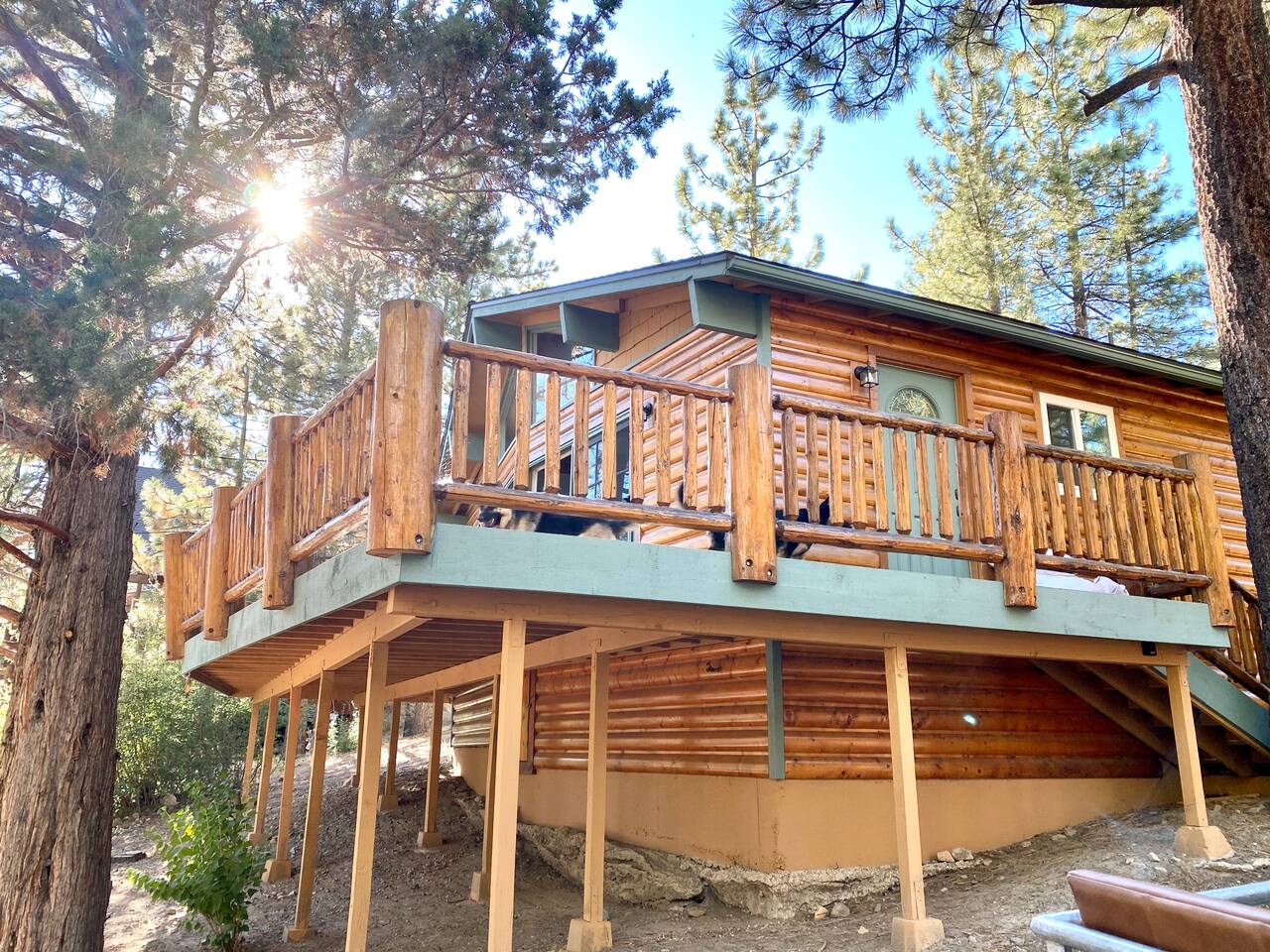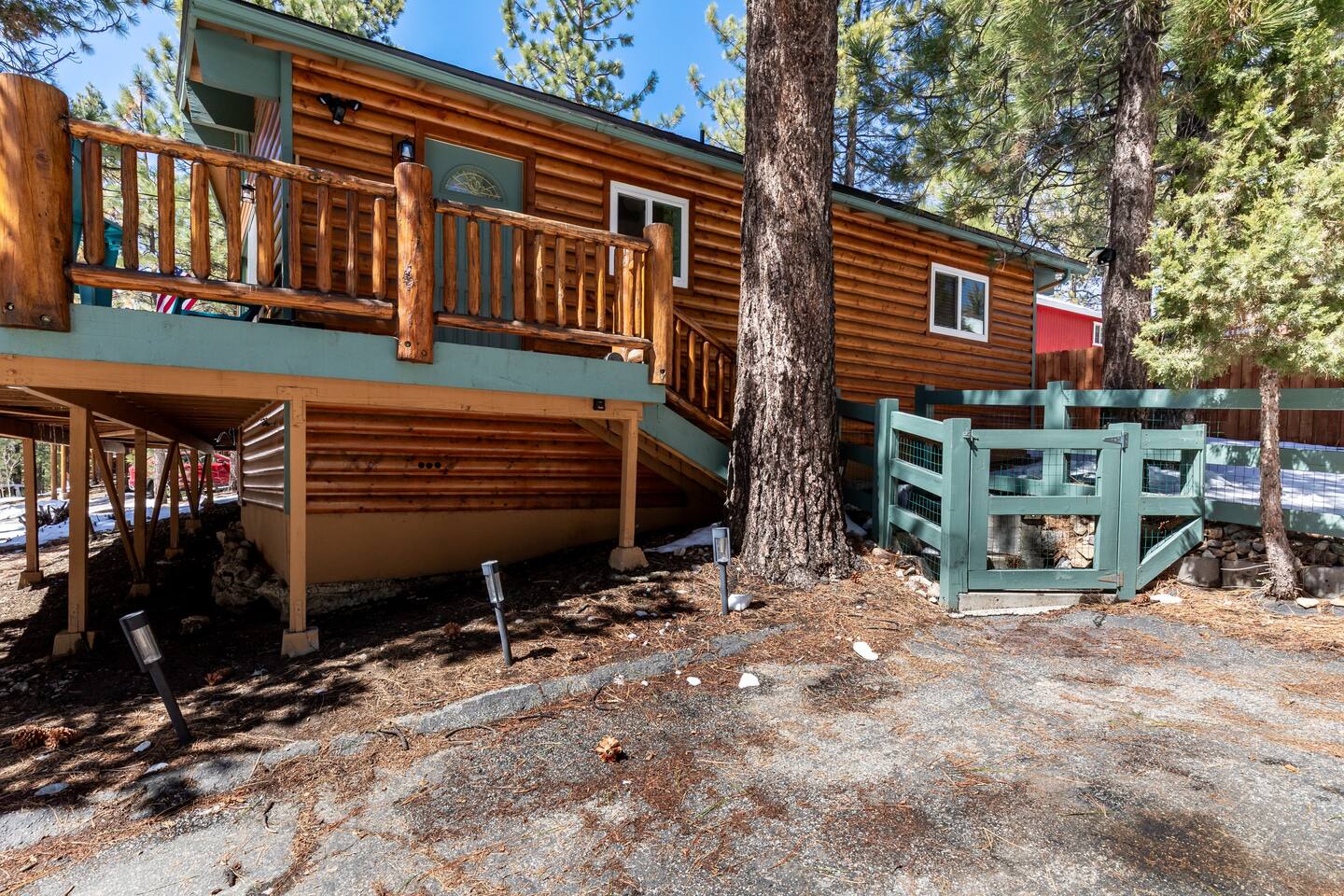 Chalet Monterey will greet you with a spacious open floor plan and knotty beamed vaulted ceilings throughout, plus a toasty wood-burning fireplace to keep you cozy while you watch the snowfall in the great outdoors through a wall of windows. Built for entertaining, the great room and kitchen are divided by a large high top bar and when the 2 sliding doors are open, you'll have twice the space on the new trex deck where you'll find an additional dining table for 4, propane grill, and a hot tub to enjoy after a long day of adventure. Enjoy your favorite shows, streaming TV and movies on the 65 inch flatscreen Smart TV while lounging on the comfy dual reclining sectional sofa outfitted with USB charging stations (Guests to use their own accounts for streaming services like Netflix, Hulu, Amazon Prime, etc). The fully operational kitchen has everything you need to prepare meals and new appliances -- we've got the "tools," you bring the "ingredients.” Grocery Outlet, Vons and Stater brothers are literally around the corner for supplies Each bedroom has TVs and brand new beautiful rustic log furniture. The master bedroom boasts a King-sized log bed, as well as a new LG washer and dryer (starter set supplied). The second bedroom is perfect for additional guests or the kids with two log framed full sized beds. Cabin has one full bathroom with tub. Check out our long list of amenities!