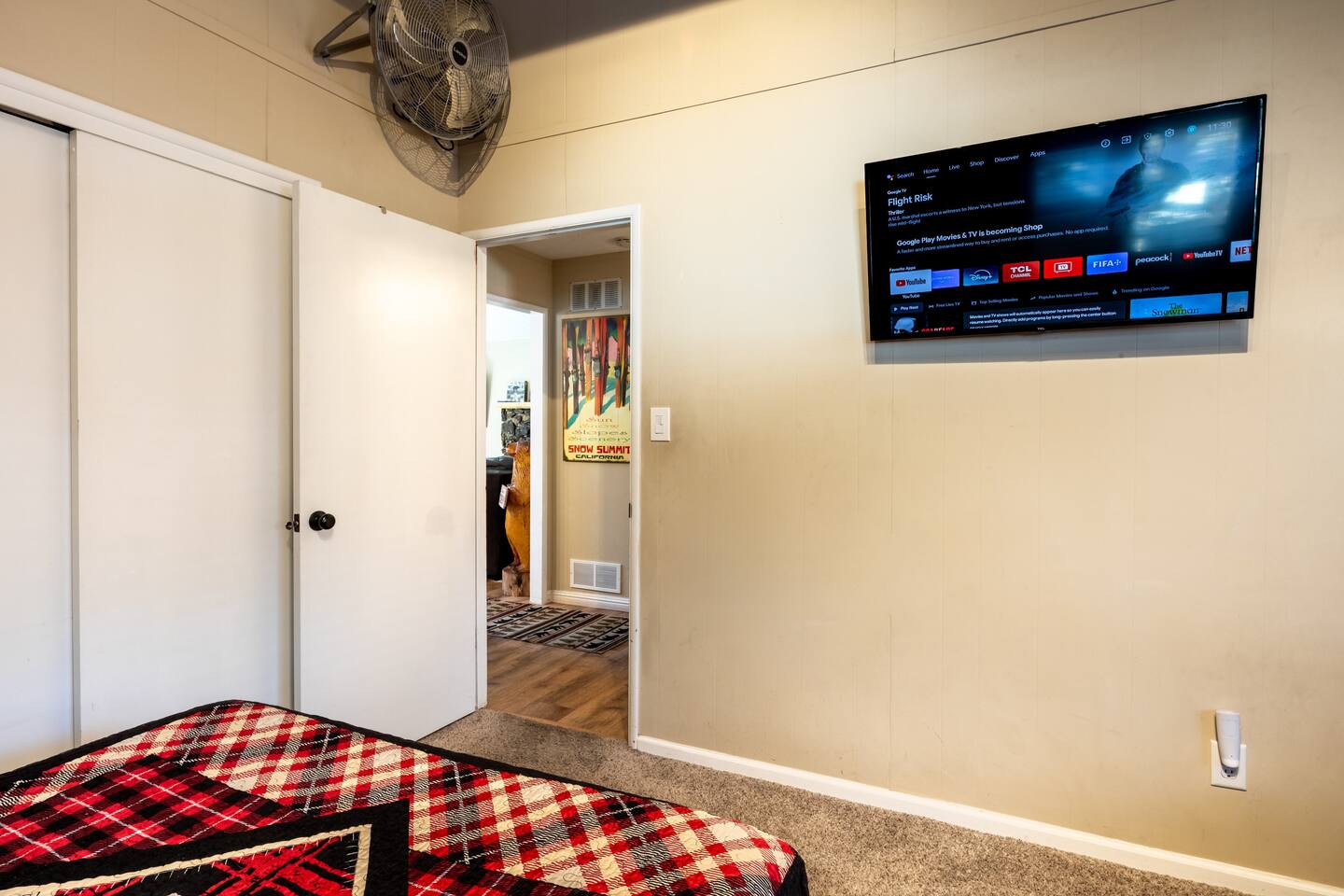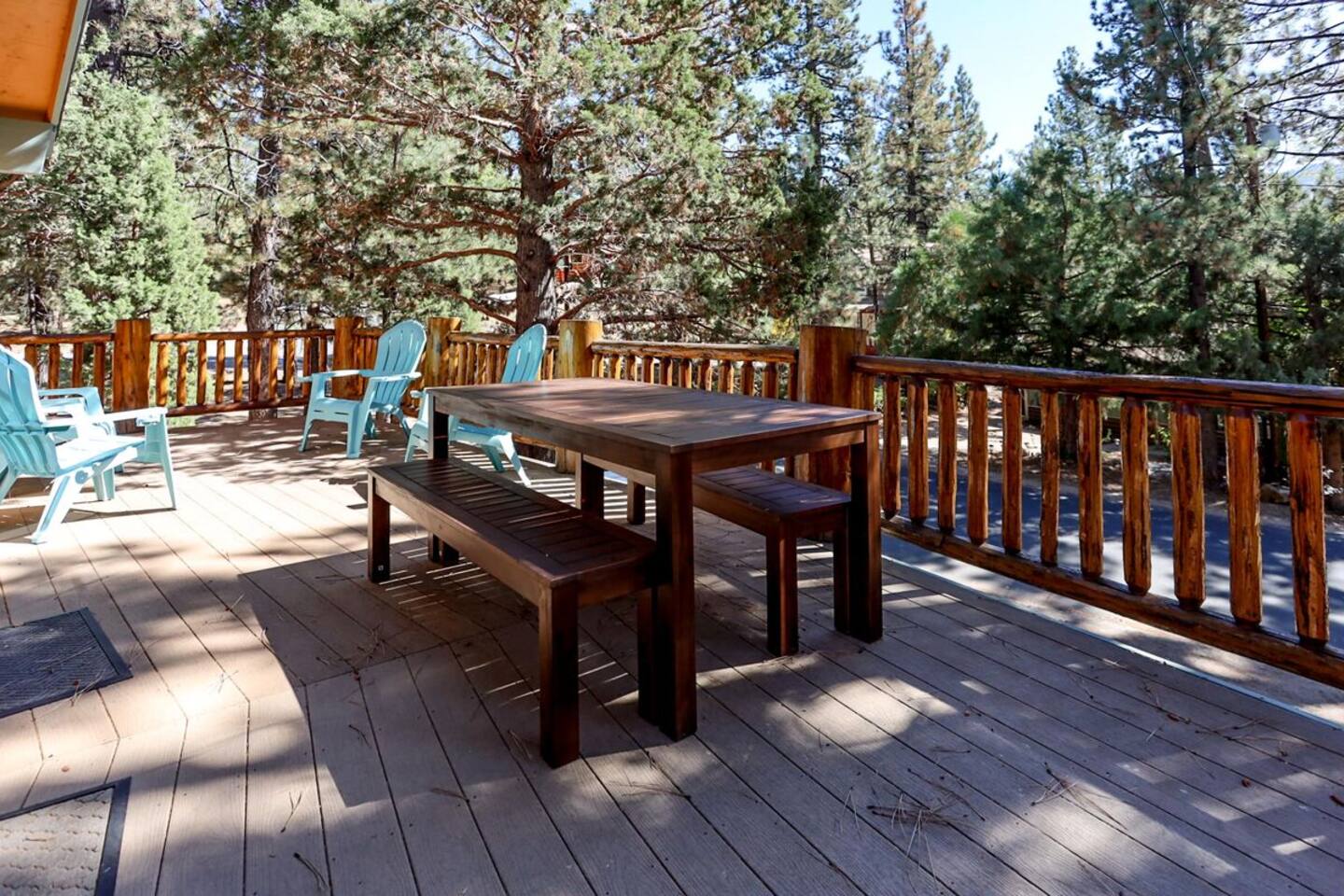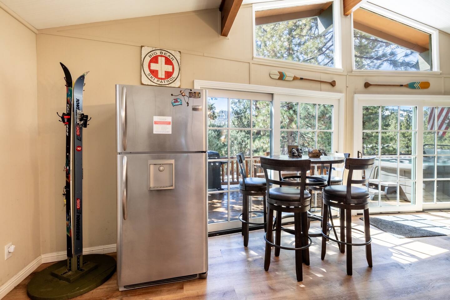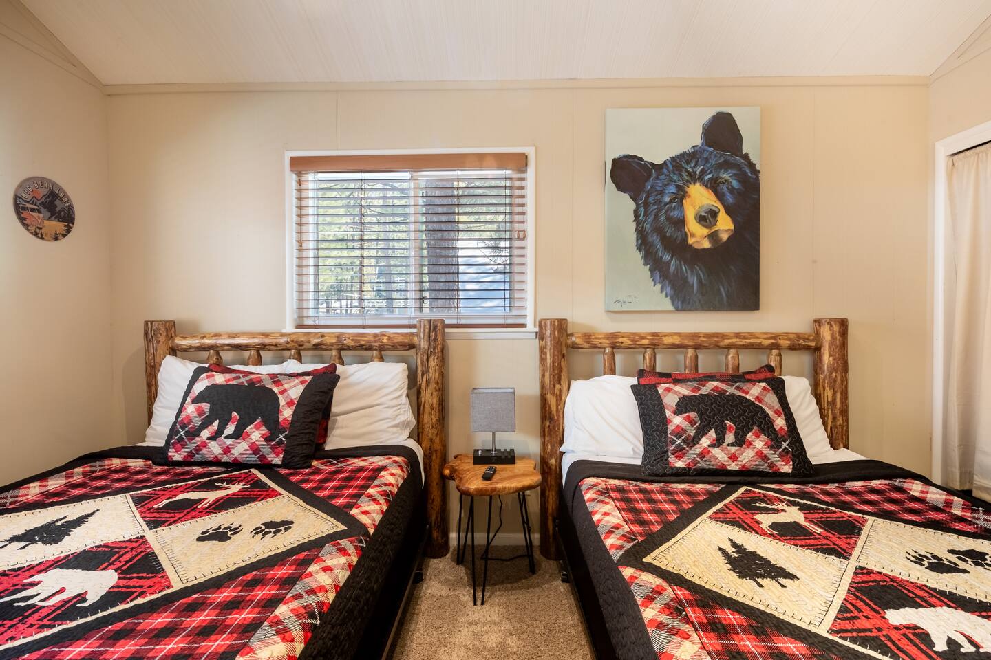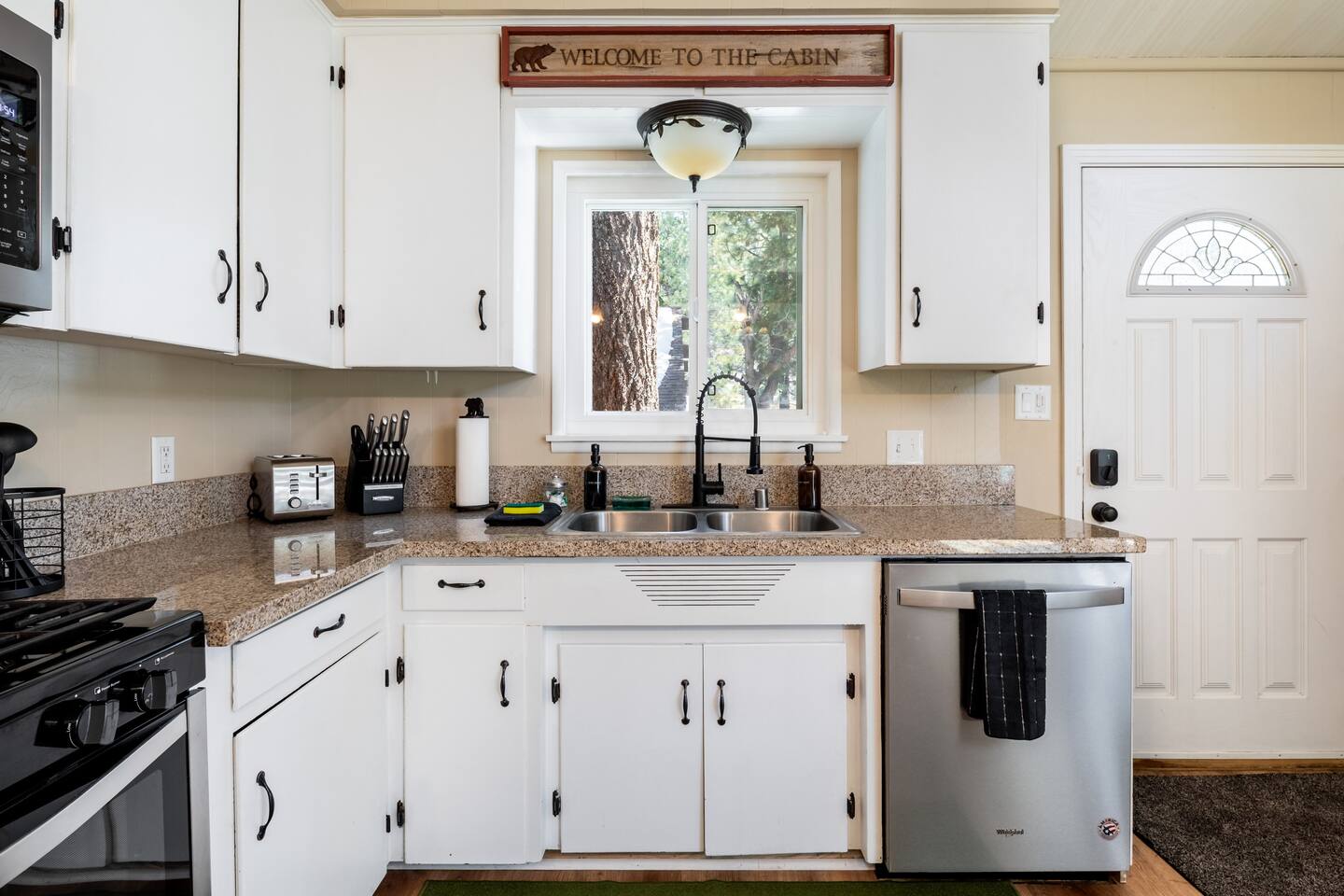 Chalet Monterey will greet you with a spacious open floor plan and knotty beamed vaulted ceilings throughout, plus a toasty wood-burning fireplace to keep you cozy while you watch the snowfall in the great outdoors through a wall of windows. Built for entertaining, the great room and kitchen are divided by a large high top bar and when the 2 sliding doors are open, you'll have twice the space on the new trex deck where you'll find an additional dining table for 4, propane grill, and a hot tub to enjoy after a long day of adventure. Enjoy your favorite shows, streaming TV and movies on the 65 inch flatscreen Smart TV while lounging on the comfy dual reclining sectional sofa outfitted with USB charging stations (Guests to use their own accounts for streaming services like Netflix, Hulu, Amazon Prime, etc). The fully operational kitchen has everything you need to prepare meals and new appliances -- we've got the "tools," you bring the "ingredients.” Grocery Outlet, Vons and Stater brothers are literally around the corner for supplies Each bedroom has TVs and brand new beautiful rustic log furniture. The master bedroom boasts a King-sized log bed, as well as a new LG washer and dryer (starter set supplied). The second bedroom is perfect for additional guests or the kids with two log framed full sized beds. Cabin has one full bathroom with tub. Check out our long list of amenities!