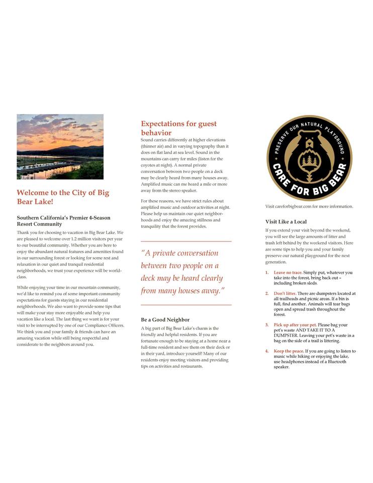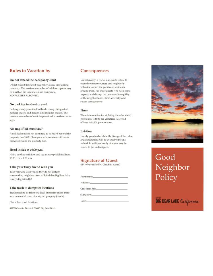 Wood burning fireplace with quick start key. (bring your own wood to burn) A desk with phone/laptop chargers are provided. Free High Speed Fiber Optic Internet also provided. Guests must sign Good Neighbor Policy. Required by City. A copy of the Policy will be emailed to Guests for their review and electronic signature prior to check in. Big Bear Lake requires all trash to be disposed at a designated Clean Bear Site. Any trash left behind at our Cabin is not covered by the cleaning fee and $25 per bag shall be charged to the Guest. All used dishes/pans must be washed and left to dry in the dish rack at the end of your stay. Guests may be charged $25 for leaving dirty dishes and pans. No Smoking/Vaping on premises please. Please do not use Snow Paint on premises. Thank you.