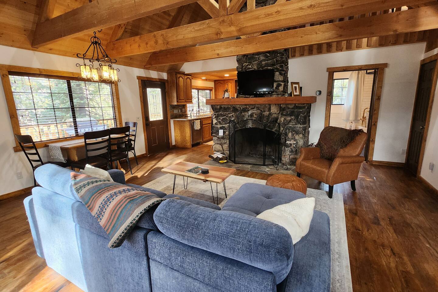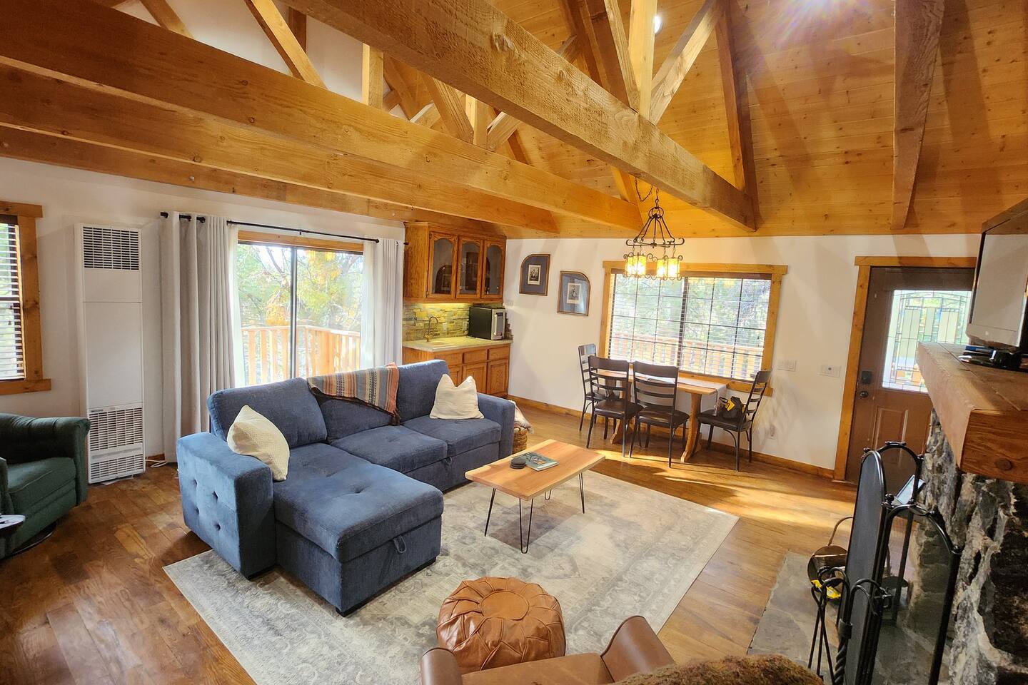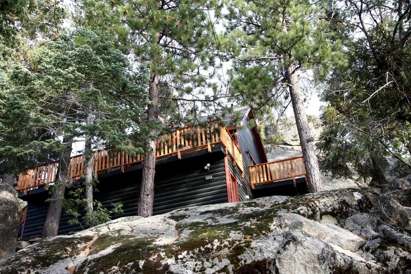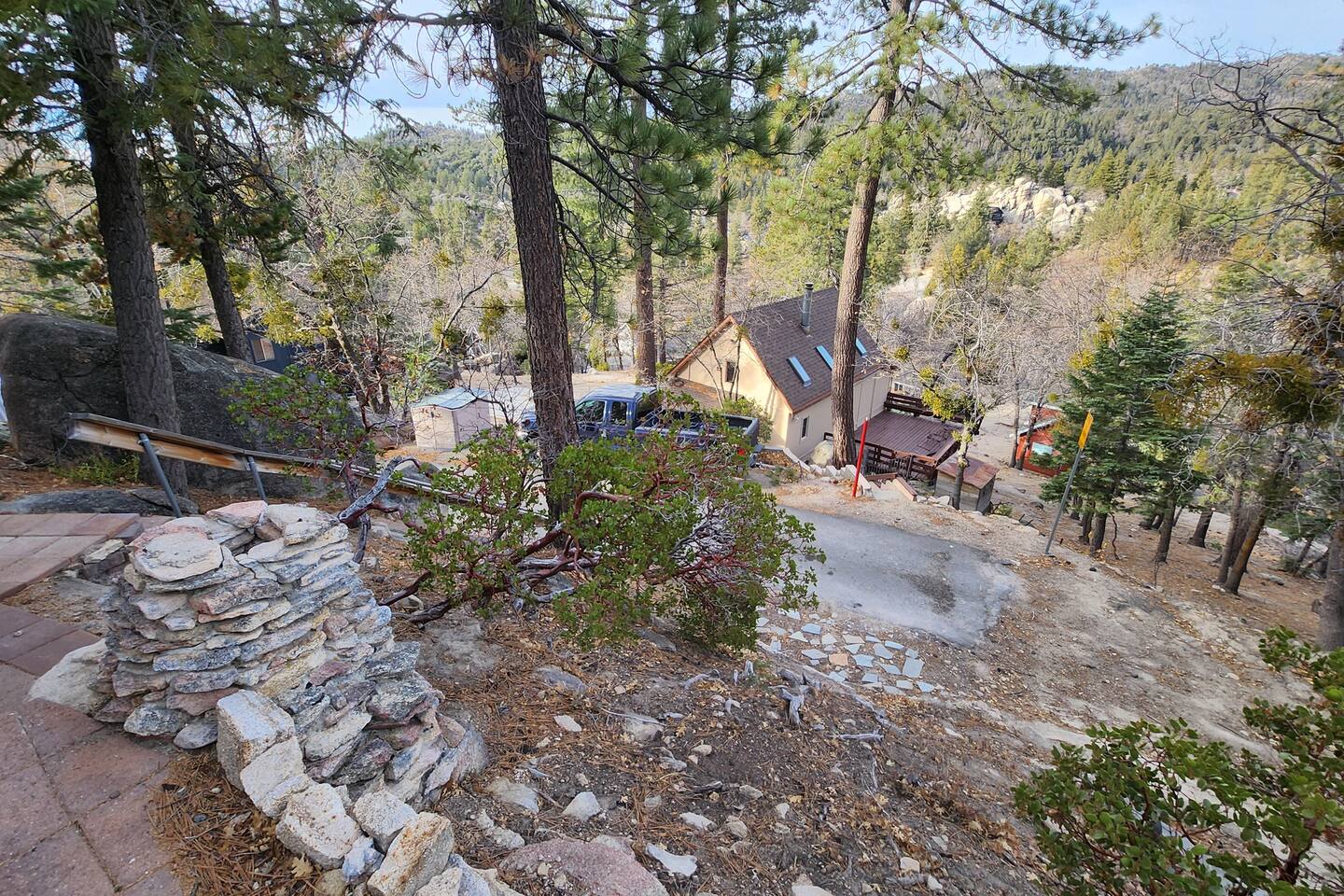 HIGHLIGHTS: 7 minutes to Snow Valley Resort & Rim Nordic Bike Park, 15 minutes to Sky Park 20 minutes to Lake Arrowhead village 25 minutes to the Big Bear Lake dam. -Hiking trail access on property -Open concept exposed timber construction -Modern appliances -Spa style remodeled bathroom -Huge center stone fireplace Escape the hustle and bustle and find your tranquility in this charming cabin nestled amidst towering pines and large Rock formations. Surrounded by breathtaking mountain views, this secluded retreat offers the perfect blend of peace and adventure. This cabin is ideal for a couples retreat or small family who wants a place that is close to all the mountain has to offer while providing plenty of adventures in and around the cabin should you choose a staycation there. The cabin is built around an oversized center stone fireplace with oversized hearth. Perfect for those cold nights to cozy up on the couch, enjoy a meal, relax to music with the record player and Bluetooth sound system, or challenge your family or friends to games. Behind the fireplace is a fully equipped kitchen with modern appliances and all the conveniences you would expect at home. The loft features a nice size closet and queen size bed for you to relax and rejuvenate after a day’s adventures. The bathroom has been completely updated and features double sinks, soaking tub, full size washer/dryer and heated flooring. You’ll find yourself immersed in the beauty of nature. You’ll have access to two decks. The larger deck is great for BBQs and hanging out with the whole family. The smaller deck off the living room has great views of the forest, stars, and large rock formations that rock climbers will enjoy exploring. A trailhead is located at the property that goes to the top of the boulders for breathtaking views or hike down to a seasonal creek located below the property. Between April and early June, you'll also have the calming sounds of rushing water as the snow pack melts and fills the creek that runs along the property and trails and feeds Arrowbear Lake just below the property.